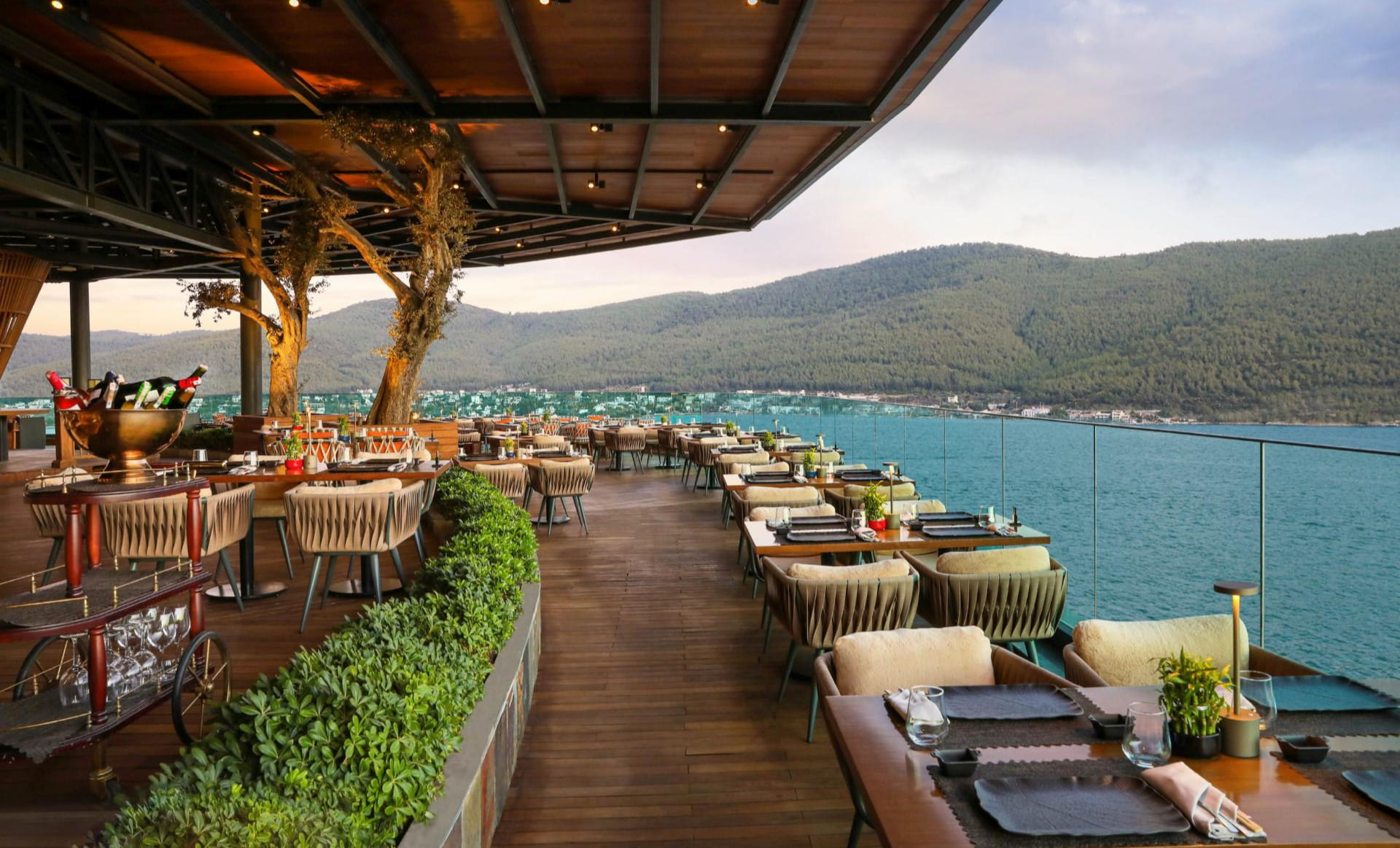 Gün batımından gün doğumuna kadar büyüleyici manzaramızın yüzünüzde bir gülümseme ile deniz ürünleri lezzetleri eşliğinde izleyebileceksiniz.